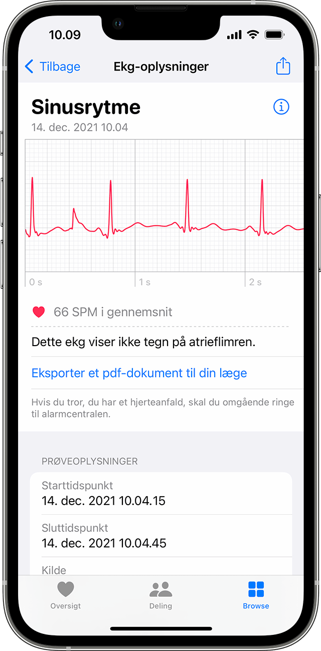 EKG-kurven, de tilknyttede klassifikationer og alle registrerede symptomer bliver arkiveret i appen Sundhed på din iPhone. Du kan også dele et PDF-dokument med din læge.